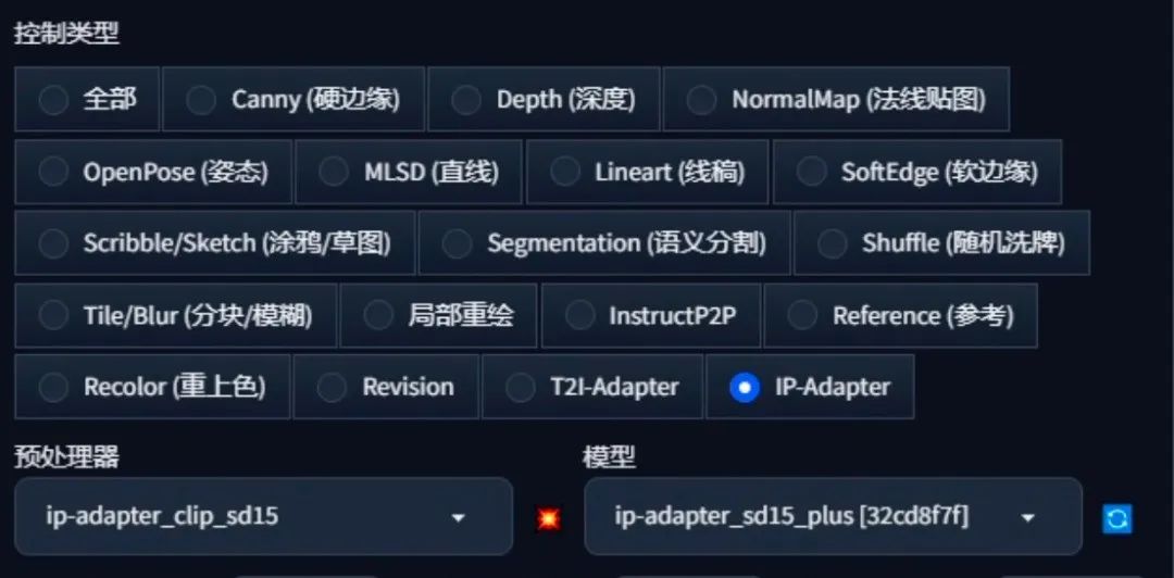 2. 控制类型选择“IP-Adapter”,模型选择“ip_adapter_sd15_plus.pth”也可以选择“ip_adapter_sd15.pth”模型。
