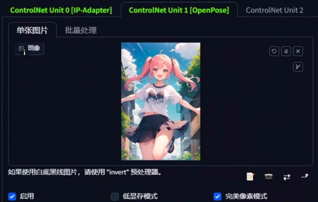3. 点击“ControlNet Unit 1”上传一张姿势参考图,然后“启用”ControlNet并且勾选“完美像素模式”。