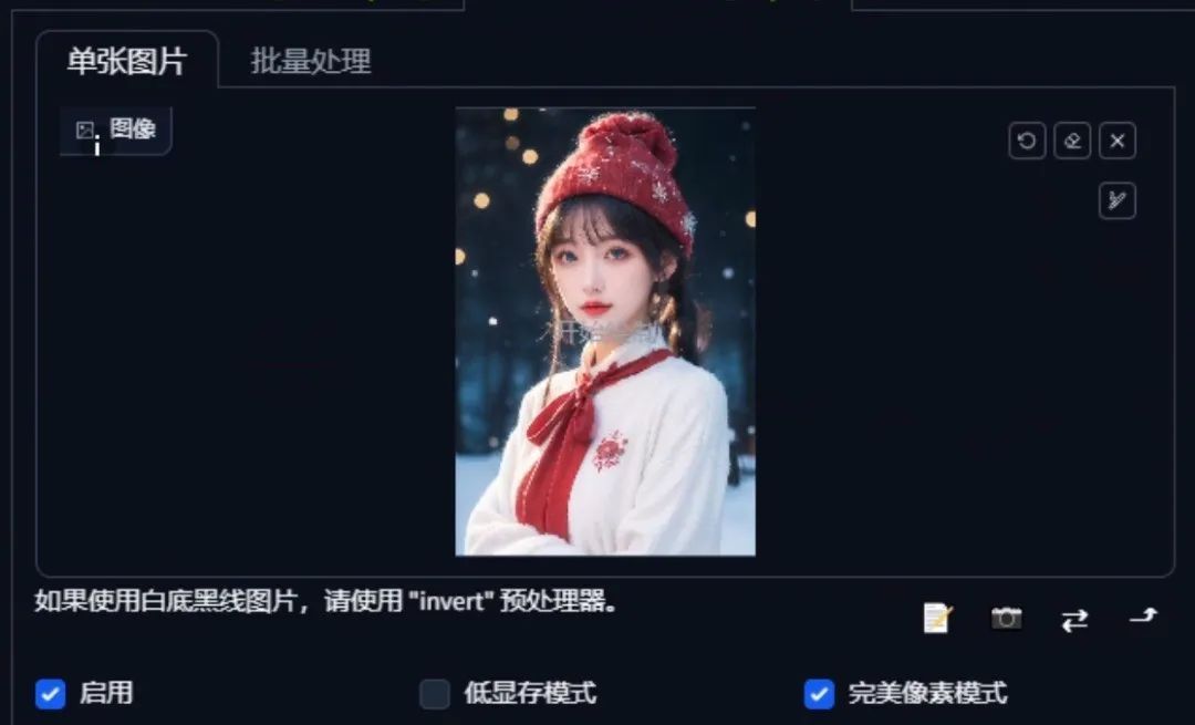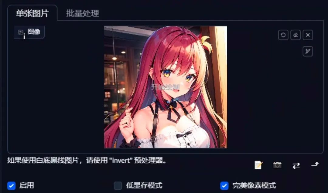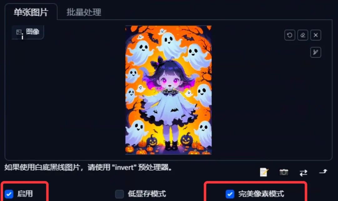 1. 首先打开“Stable Diffusion”,上传一张参考图,然后“启用ControlNet”并且勾选“完美像素模式”。