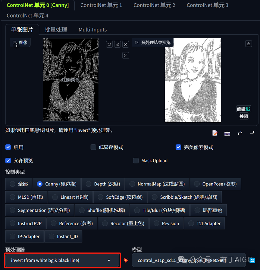 因为线稿通常是白底黑线,但是我们通过Canny或其它线稿提取模型生成一张线稿之后,将会发现底色为黑,线条为白。