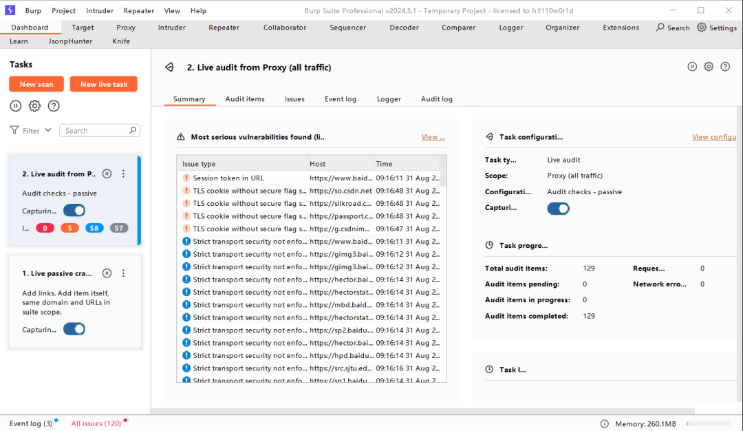 代表着一些监控问题及日志和显示当前burp自动爬取目标网站的可行度