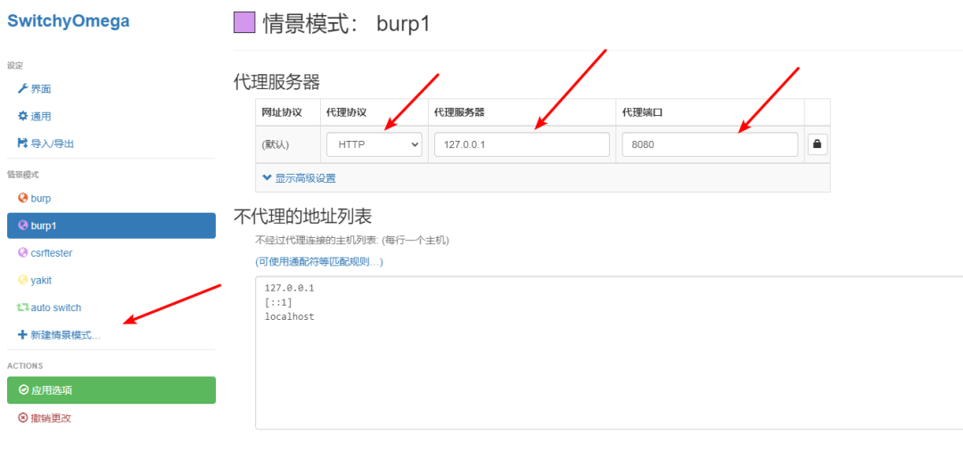 添加一个新情景模式配置代理协议为http协议,代理服务器和代理端口与我们前面在burp中设置的要一致,最后我们配置好以后应用选项就OK了
