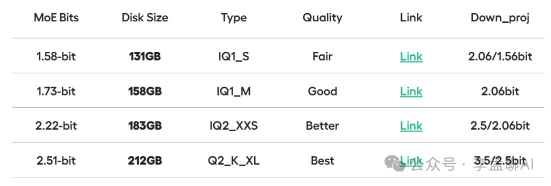 Unsloth AI 已经发布了多个动态量化变体,每个变体在模型体积和输出质量之间做出了平衡: