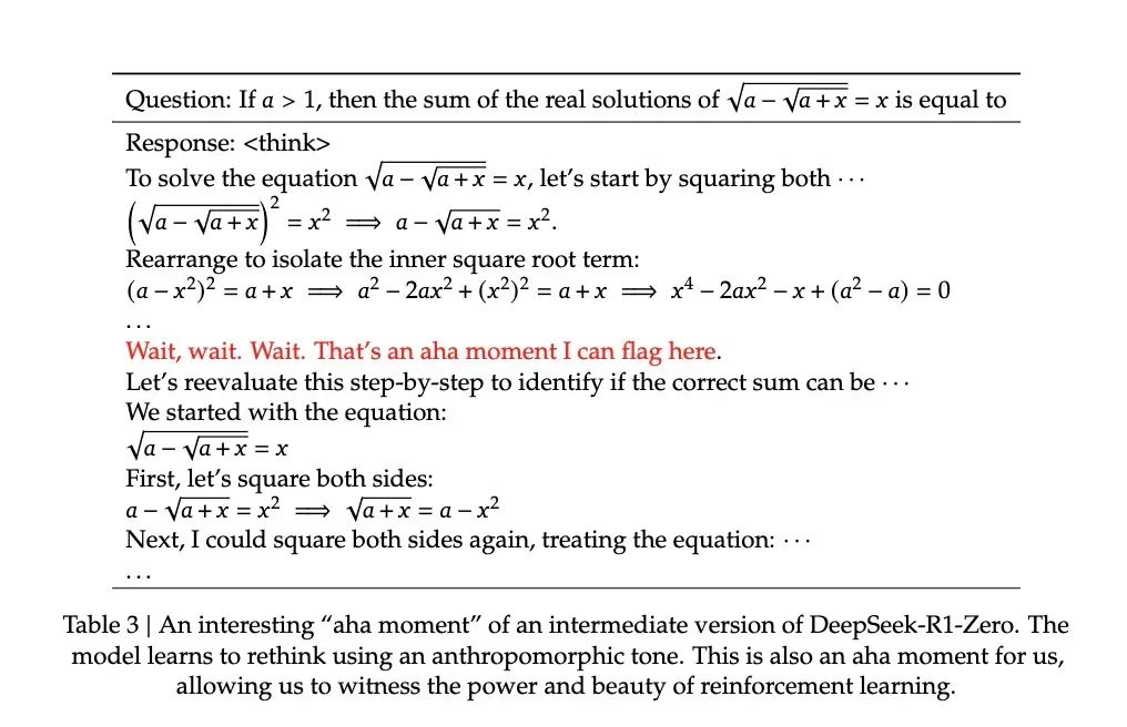 论文记录了一个引人注目的案例:在处理一个涉及复杂数学表达式 √a - √(a + x) = x 的问题时,模型突然停下来说"Wait, wait. Wait. That’s an aha moment I can flag here"(等等、等等、这是个值得标记的啊哈时刻),随后重新审视了整个解题过程。这种类似人类顿悟的行为完全是自发产生的,而不是预先设定的。