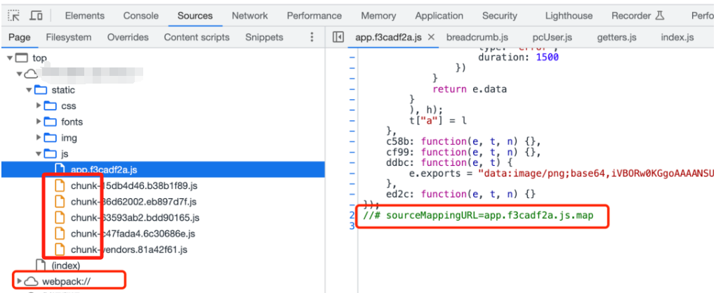 一般情况下,网站不会出现 Webpack:// 和 sourceMappingURL=app.f3cadf2a.js.map 这样的话可以直接看到前端原始代码,网站的前端代码分析会容易非常多,也容易寻找到接口进行拼接尝试未授权访问,前端代码或 .js 文件过多时可以使用 Packer Fuzzer 工具。