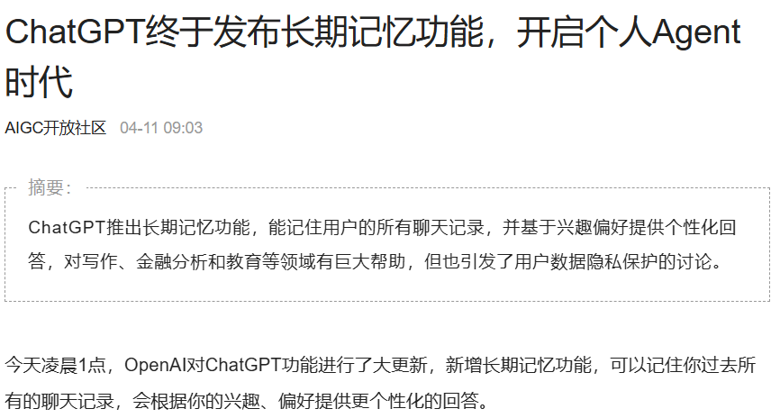 ChatGPT尝试去做有长期记忆,目前(25年6月)以已经实现了持久记忆功能Memory。持久记忆允许在不同会话之间保留信息,该功能支持的模型主要版本时GPT-4 Turbo(及以后)。