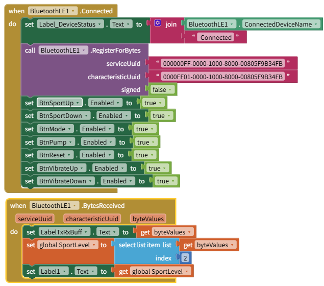4. 如果需要实时监听收到的数据,则需要先调用BLE.RegisterForBytes方法,然后在BLE.BytesReceived事件里处理接收到的数据:
