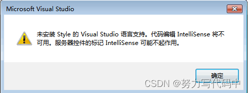 最近在使用Visual Studio 2019 开发时,遇到了这样一个问题:Visual Studio 2019 未安装Style的语言支持,代码编译IntelliSense 将不可用。 服务器控件的标记IntelliSense可能不起作用。 弹出了好多小窗口, 使我的VS程序不能正常启动,网上搜了搜解决办法, 现自己将解决办法写出,供大家参考。