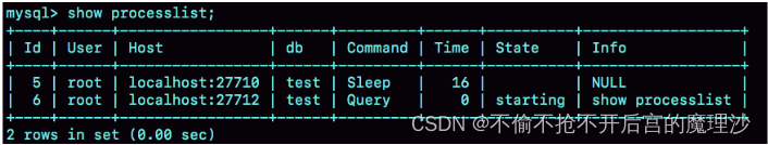 文本中这个图是 show processlist 的结果,其中的 Command 列显示为“Sleep”的这一行,就表示现在系统里面有一个空闲连接。