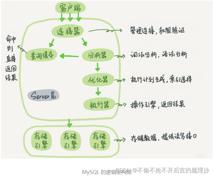 Server 层:包括连接器、查询缓存、分析器、优化器、执行器等,涵盖 MySQL 的大多数核心服务功能,以及所有的内置函数(如日期、时间、数学和加密函数等),所有跨存储引擎的功能都在这一层实现,比如存储过程、触发器、视图等。
