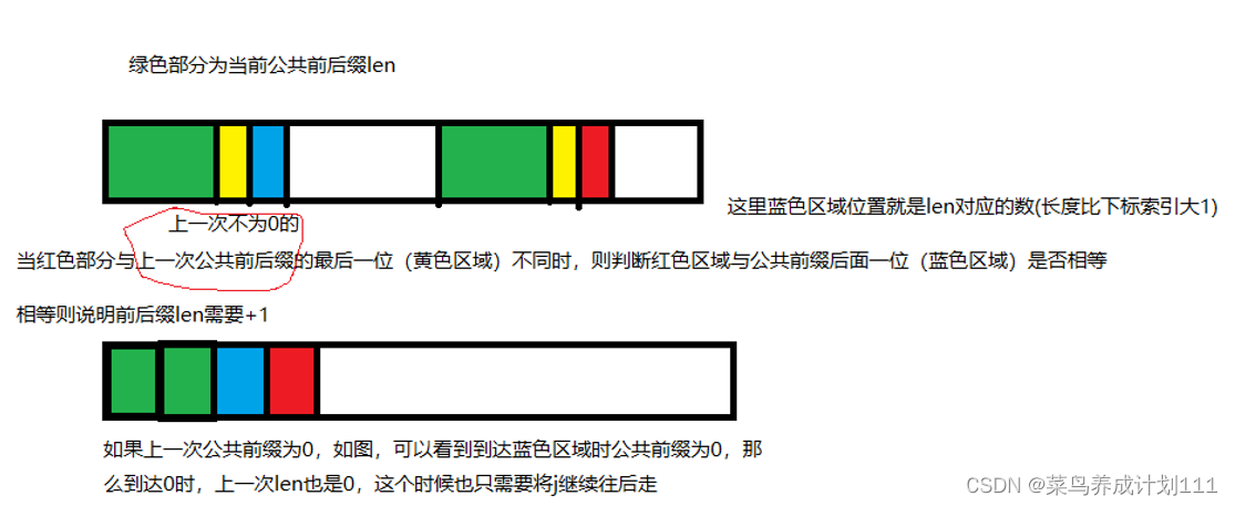 让此时的公共前后缀等于上一次的公共前后缀长度,这样就走到上一个判断,判断上一次的前缀末尾后面的数(len位置,因为长度是比索引数多1的,所以是前缀后面一个数),判断该数是否等于当前这个不相等的数)