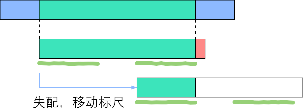 (3)目标串与模式串不相等并且模式串的第一个就匹配不上(暂时不存在匹配上的),让目标串继续往后走,找到能与模式串第一个匹配的