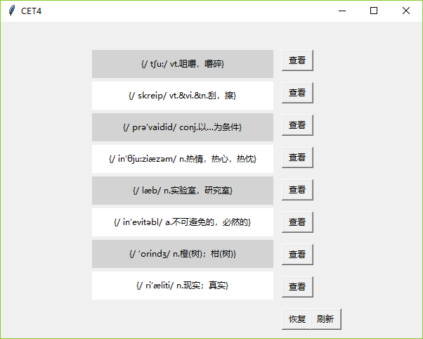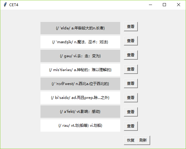 之前在一个公众号看到一个用来测试单词的小应用,使用web应用实现的,于是,结合最近学的Python的tkinter模块,给它做了一个窗体,还添加了 一些其他的小功能。