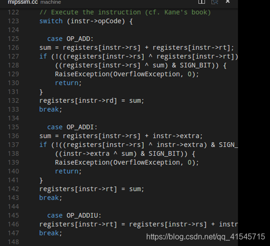 然后看看OneInstruction(),感觉主体是一堆的case。当执行不同的指令时,寄存器的数组里存放不同的数。
