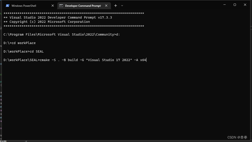先去Github上将代码下载下来GitHub - microsoft/SEAL: Microsoft SEAL is an easy-to-use and powerful homomorphic encryption library.,然后进入解压后的代码目录,打开Visual Studio 2022 的 Developer Command Prompt For VS 2022 终端,进入代码目录依次执行以下三个命令(记得看下自己电脑是x64还是x86)
