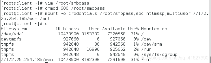 mount -o credentials=/root/smbpass,sec=ntlmssp,multiuser //172.25.254.152/wen /mnt/