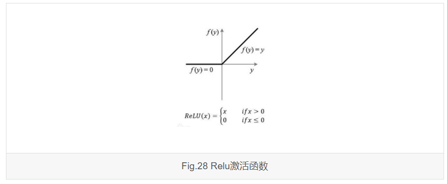 我们知道,当我们在认真做一件事的时候,经常会忽略其他不相干的事物,这可以被称为信息的选择性接收。从微观角度来说,完成这样的一项任务,是大脑中的神经元对输入信号做出的选择性响应,这被称为神经元工作的稀疏性。但是如何让我们的人工神经网络也具有这样的优点呢?Relu函数便是一个例子。从 Fig.28来看,Relu 函数的特别之处它存在一个死区特性,对于信号强度小于一定值的输入,它的输出直接置 0,而当信号强度足够大时,它就直接将该信号不加改变地进行输出。这样的方法可以帮助我们的人工神经网络在滤除微小噪声的同时还不改变有用信息强度,进一步提高了特征的鲁棒性。