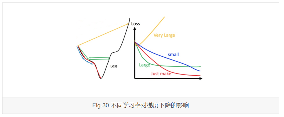 固定学习率一般很少使用,原因在于要想模型正确地收敛,找到一个合适的固定学习率是不容易的。学习率过大会导致梯度下降过快甚至出现过冲的现象,而学习率过小,会导致收敛速度极度缓慢,甚至会囤于某一局部极小值不能挣脱。下面这张图很好地解释了这个问题:
