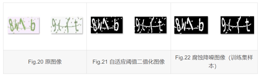 将 ImageCaptcha 类生成的 BytesIO 类图像转换成能够进行图像处理的 array 类型, 并对原始图像依次进行灰度化、运用自适应阈值的二值化以及噪点腐蚀降噪处理;