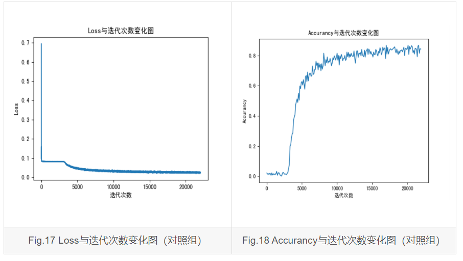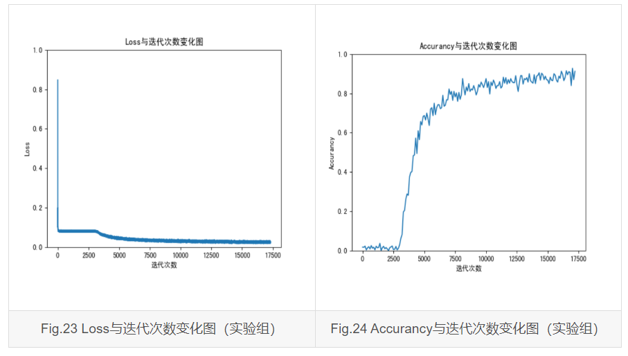 首先对于 Loss 的下降去情况,从 Fig.17 与 Fig.23 对比可以发现,两者的 Loss 随迭代次数增加的变化曲线都比较接近,而且从 Loss 下降的情况来说,在最开始很短的时间内 Loss 已经从一个较大的值下降到了一个较小的值,这说明了在这个时间内梯度下降得较快,因此可以知道这个时候的学习率是比较大的。而随着迭代次数的继续增加,Loss 逐渐趋近一个较为稳定的值,此时学习率应该是保持一个较低的值,以保证梯度下降得比较缓慢。这就从侧面反映了采用 Adam Optimizer 优化器优化算法能够有效地控制学习率大小,进而使得网络模型朝着一个相对正确的方向行进。