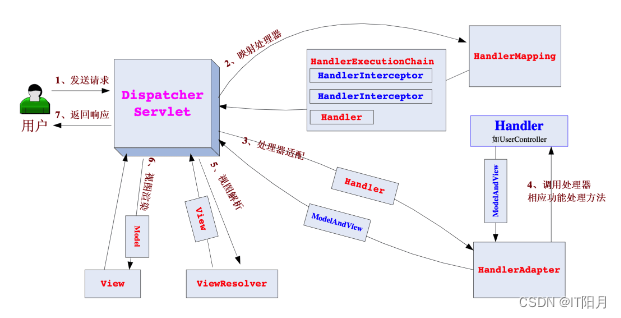 - HandlerAdapter——>处理器功能处理方法的调用,HandlerAdapter 将会根据适配的结果调用真正的处理器的功能处 理方法,完成功能处理;并返回一个ModelAndView 对象(包含模型数据、逻辑视图名);