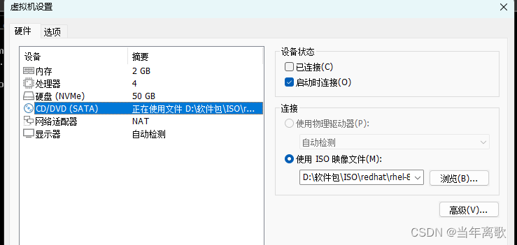 在VMmare中把镜像挂载在redhat8.2系统上。