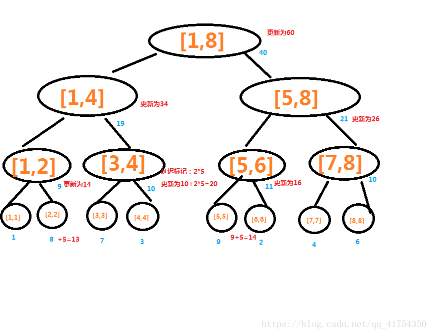 我们首先将其与[1,8]进行比较,发现所更改范围在【1,8】之内,我们往下搜索左右子树,发现【1,4】和【5,8】之中都有。先看【1,4】,先搜索它的左子树【1,2】,发现只有2需要,1不需要,所以直接让右子树2所对应的值8+5,返回,返回,至【1,4】。再看右子树【3,4】,发现这全都在更改的范围之内,所以我们在这里加入一个延迟标记并且【3,4】它本身获得它的子树那么多的增加,将扣押下来的值存储在延迟标记,需要的时候再将其放下。然后再看右子树【5,8】,然后引导至【5,6】,【6,6】直接+5就可以了。