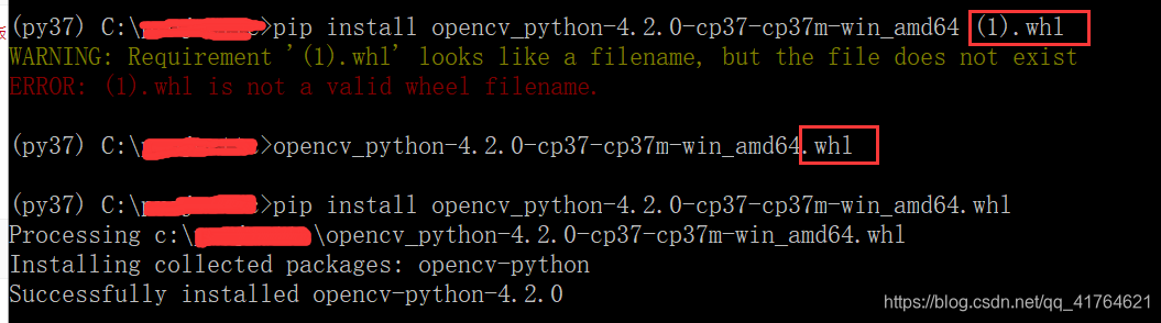 ps 下载的时候可能下载的库文件是长这样的:XXXXXX(1).whl 然后复制文件名会报错,可以把库名改一下就成了