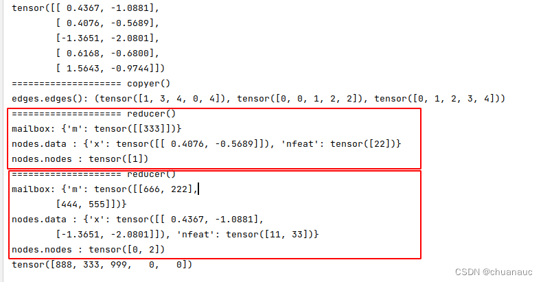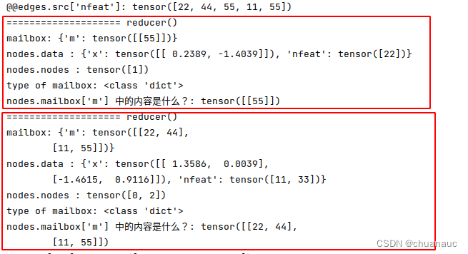 这是输出的内容: 可以看到,总共有3个入边节点,就划分成了2个nodeBatch (划分方式就是位上面举出的例子) :因此gather_all()函数就会执行两遍 reducer()函数