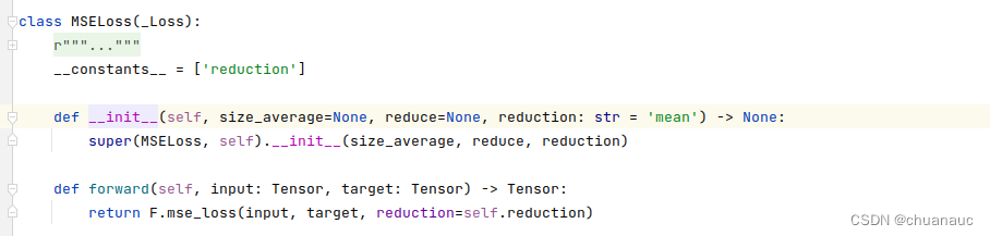 给出一个伪代码,大致就是关于 nn.Module 这个弗雷中实现了 __call__方法,由 MSELoss 子类继承,在将 子类MSELoss实例话后可以直接通过调用 __call__ 方法来使用魔法函数的特性(将实例化的对象作为函数直接调用)