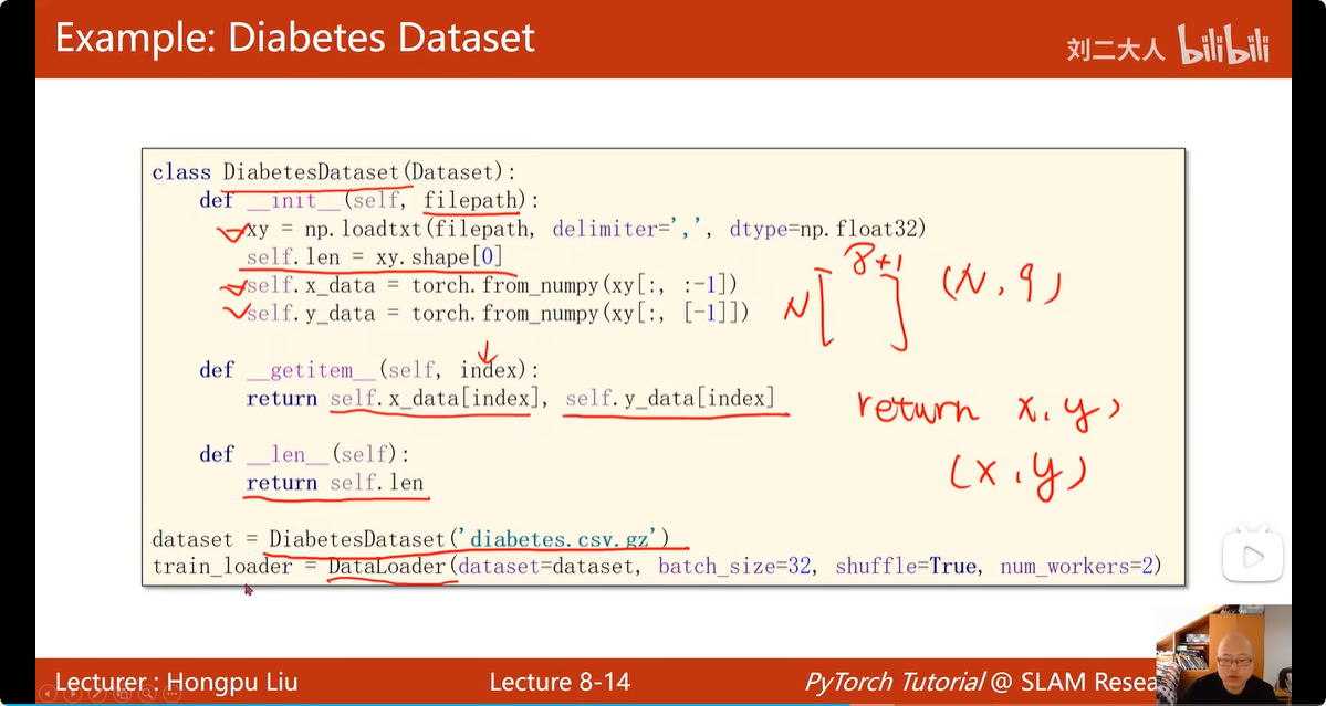 13.1 抽象类Dataset 中要实现多个抽象函数,重点说一下__getitem__() ,对于比较小的数据集,可以选择将数据全加载到内存中,依次编号,但是对于较大的数据集,比如很多张的图片这种数据集,__getitem__() 就得返回数据的文件名,调用到这个文件的时候,返回文件名,根据文件名字到对应的文件夹去找(从磁盘中现读入)