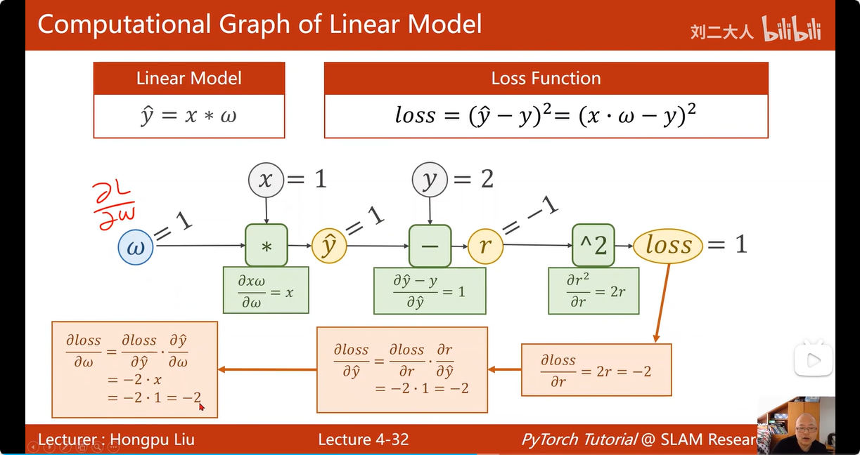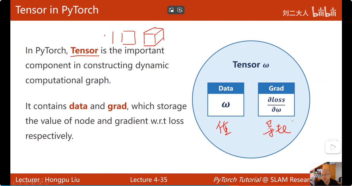 tensor 类中有两个成员:一个用于存放该变量的数值:data,另一个用于存放Loss对于该变量关于损失函数的梯度:grad