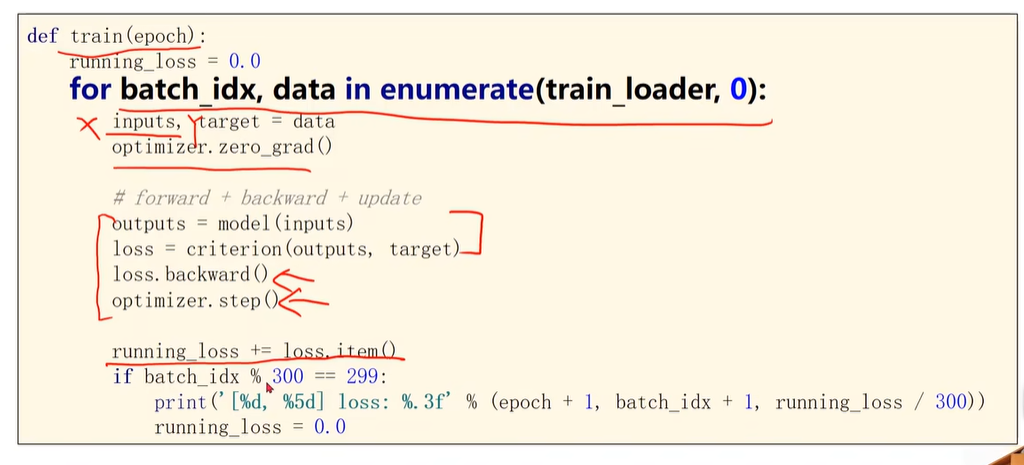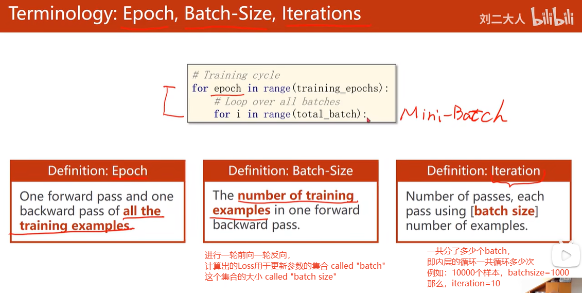 正因为把样本组织为多个minibatch,因此当前的循环变成了两层的嵌套循环,最外层表示训练的轮次(对整个iteration,对整个训练样本),内层对每一个minibatch中的全部样本进行迭代