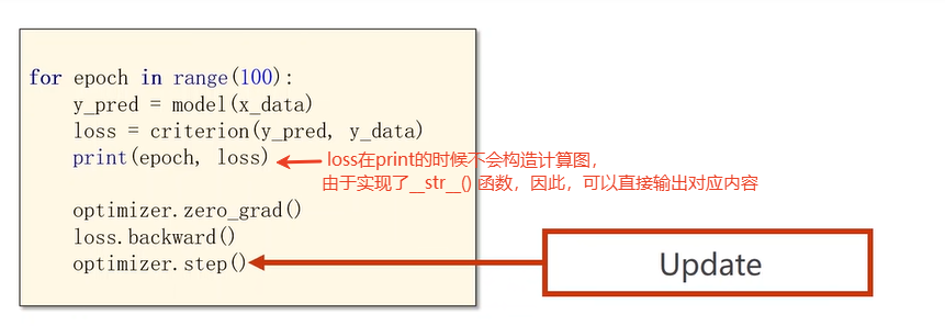 注意,由于tensor中的成员:grad也是一个tensor,为了避免出现tensor中的grad成员在执行计算的时候,以tensor类型进行计算,出现计算符重载,进行tensor类型的计算,生成计算图。因此调用tensor的成员data,获得tensor中的数值内容,对于grad来说,就是梯度值大小。【在tensor数据更新时,一定要注意!】