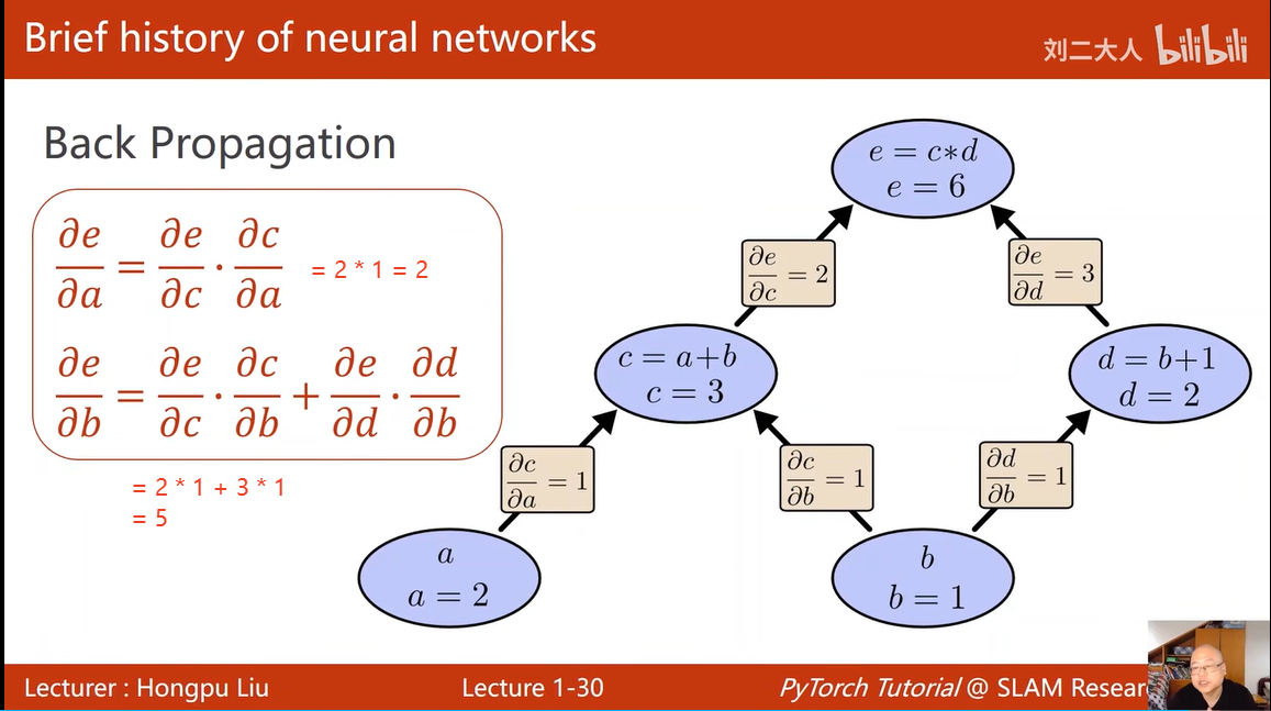 注意:有两条路径可以到达e,换句话说,e 有两个方式共同计算获得,那么,求e的导数,就通过对 c 对 d 两种方式求得