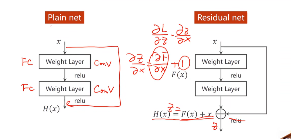 可以看出梯度相较于之前多了一个1,所以,梯度不再是一堆小于1的数值相乘,而是大于1的数值相乘,不再会梯度消失了