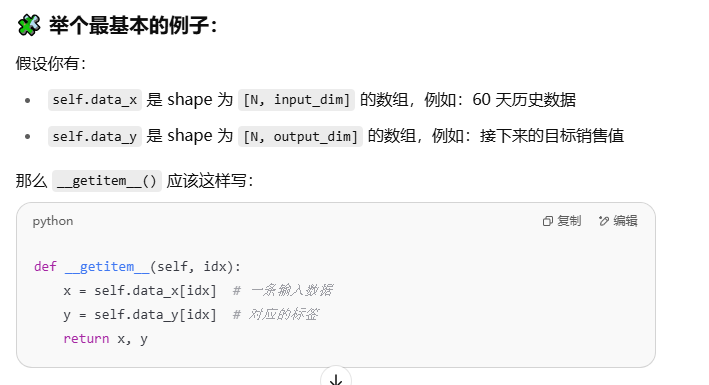 在使用 PyTorch 构造自定义数据集(继承 torch.utils.data.Dataset)时,__getitem__() 方法 返回 一个样本的数据对,也就是某一条 data_x 和对应的 data_y。