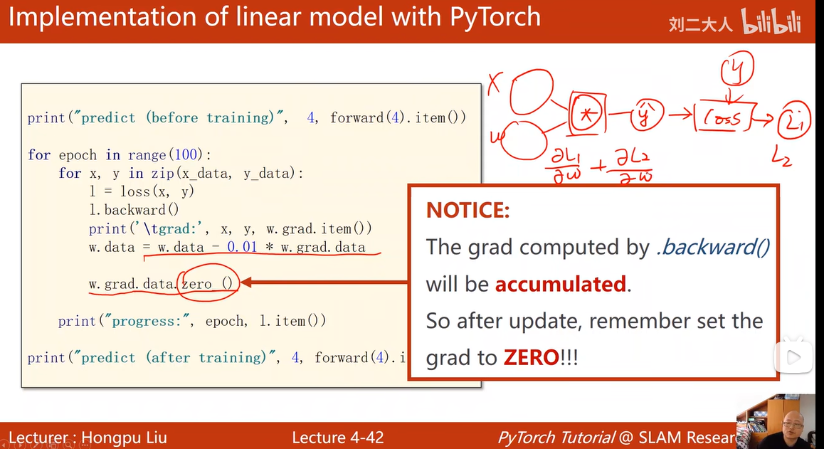 同时注意:给计算更新一次的参数W中的grad成员数值清零是必须的,不然,例如图中所示,第一次更新计算得到 L1,根据L1计算获得w的梯度,不加以清零,第二次更新计算得到L2,那么,根据L2计算获得的 w的梯度 就会与之前计算出的 相加,将