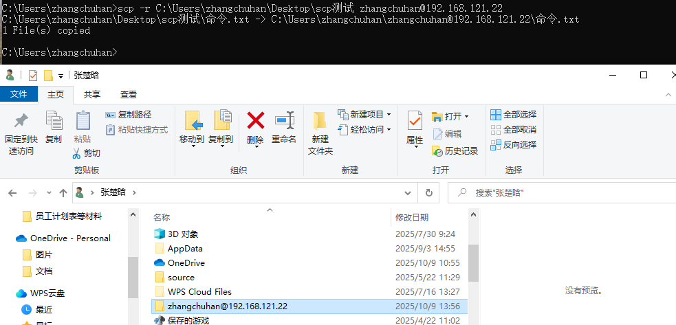 会发现: C:\Users\zhangchuhan 目录下多出个 zhangchuhan@192.168.121.22 的文件夹,里面就是 我们刚刚命令行移动的内容