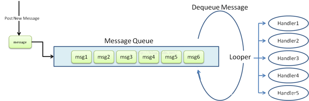顾名思义,消息,循环,处理器,我想你应该大致猜出来它们的处理流程,这就像是一个流水线,消息就是我们待处理的包裹,循环当然是传送带(ALopper)来将包裹(AMessage)传送到处理机器(AHandler)。大致流程图如下(别人画的,找不到出处):