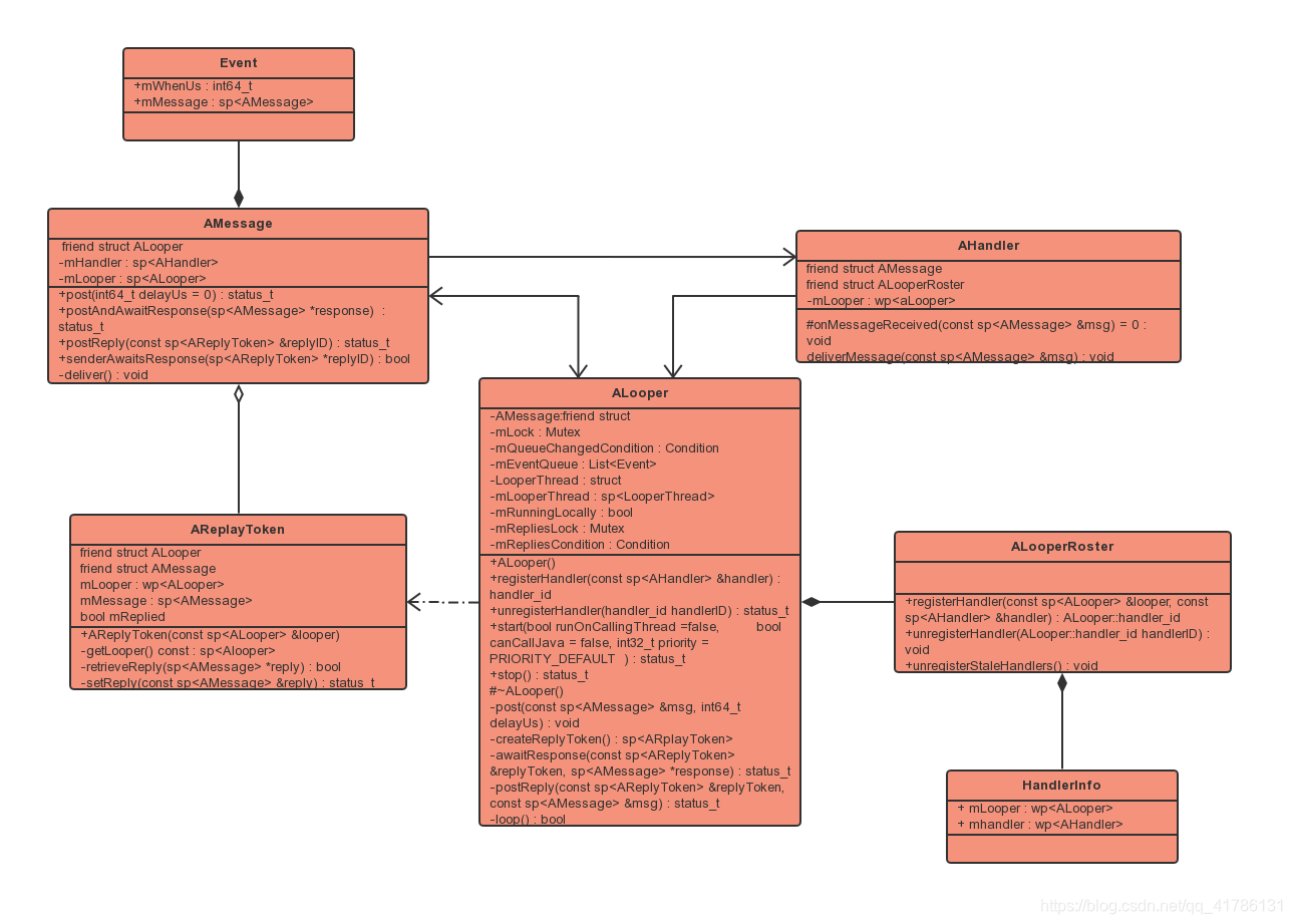 AHandler代码很简单,各部分都给出了注释,主要的就是setId()和deliverMessage()函数了,不再细说。接着看ALooper。