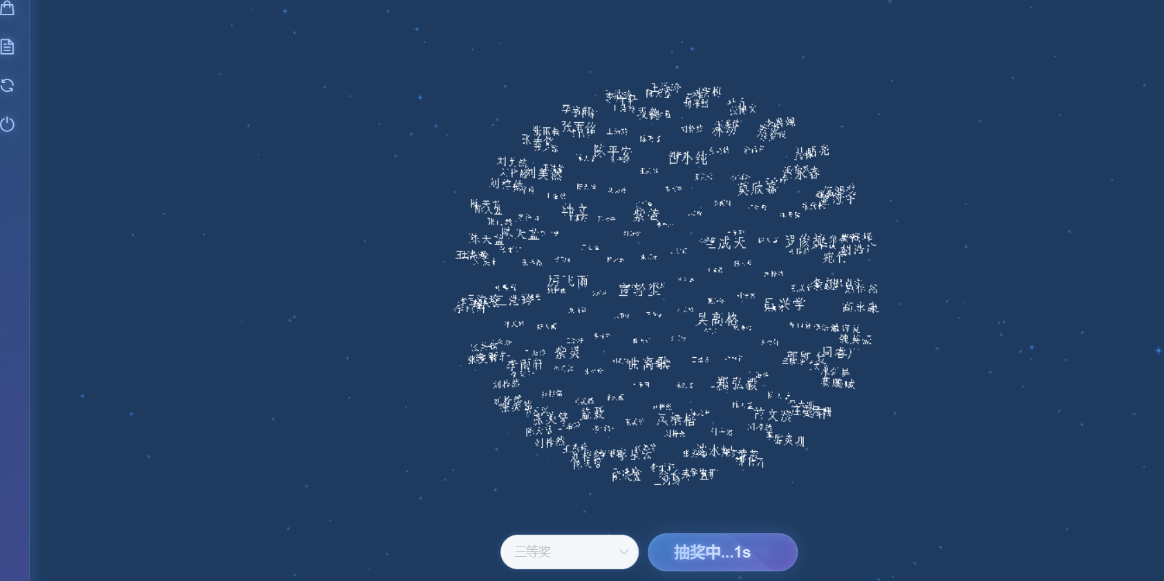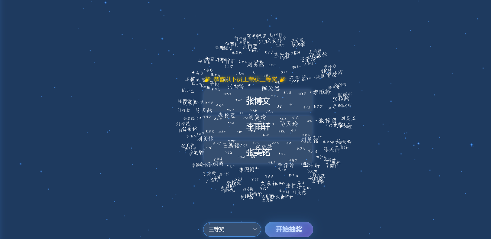 抽奖人员遍布在地球仪上缓慢转动,当选择抽奖级别,点击开始抽奖时出现倒计时,地球仪加速转动,并倒计时结束后从地球仪上抛出来中奖名单