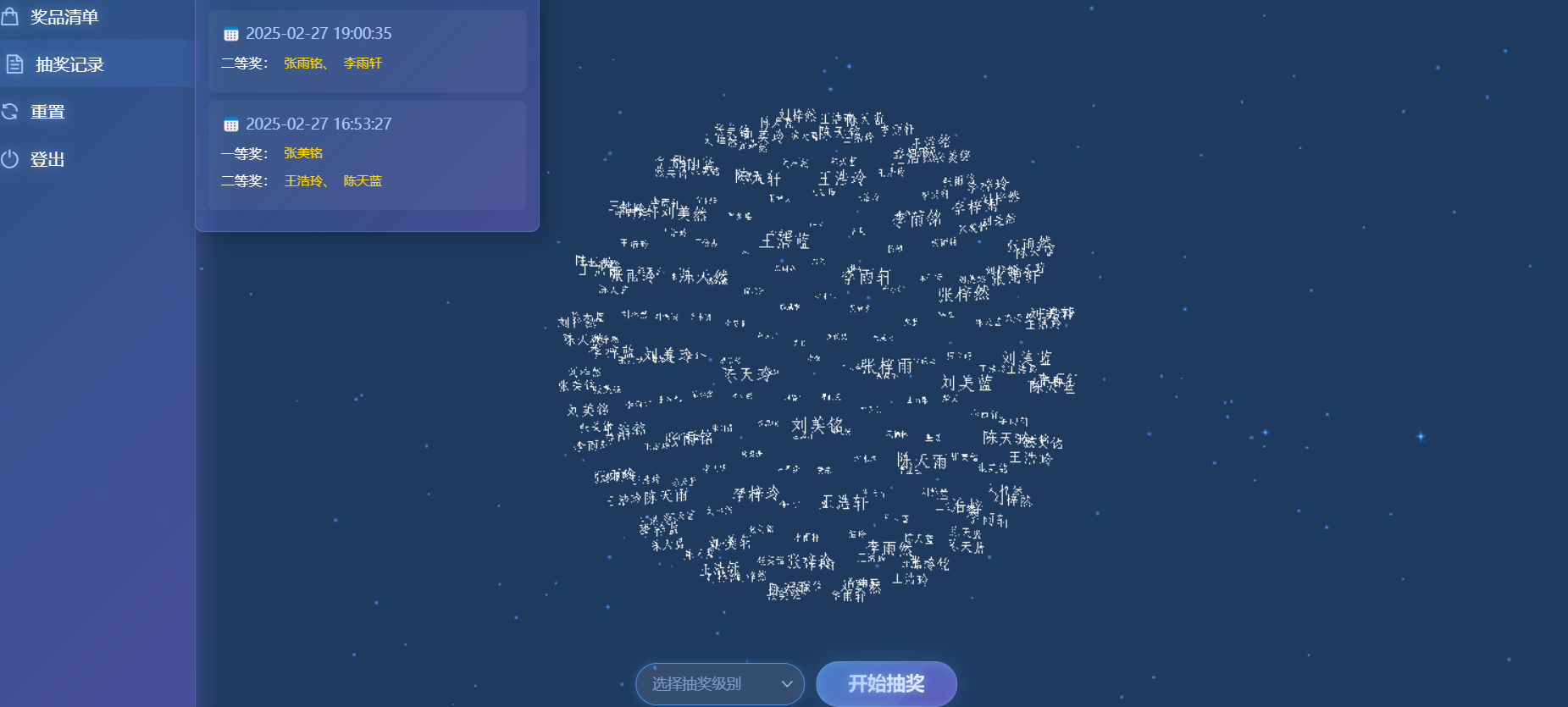 在企业年会场景中,抽奖环节往往承载着活跃气氛与员工期待的双重使命。本系统通过地球仪动态抽奖特效+智能化后台管理,实现了沉浸式3D抽奖体验:采用Three.js 与WebGL技术打造动态地球仪,员工信息在球面流动特效中随机抽取,同时支持奖项等级/人数/奖品关联的灵活配置,适配不同规模企业的年会需求。
