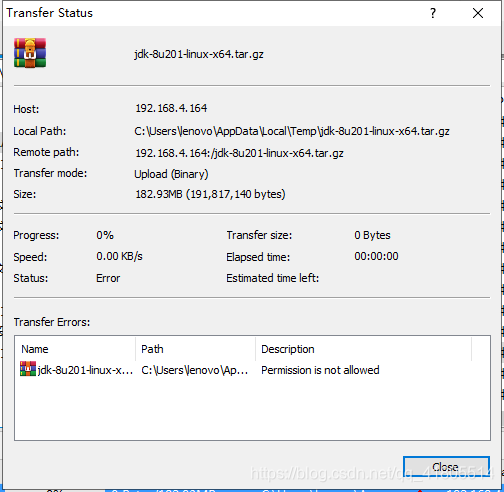 使用xftp往centos7虚拟机上上传一个java8的压缩文件,结果出现以下问题: