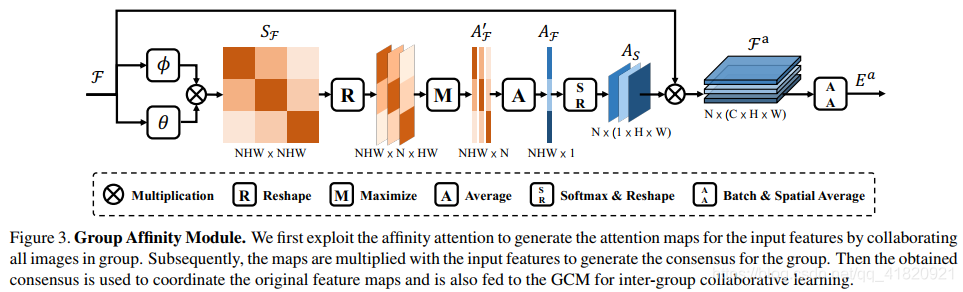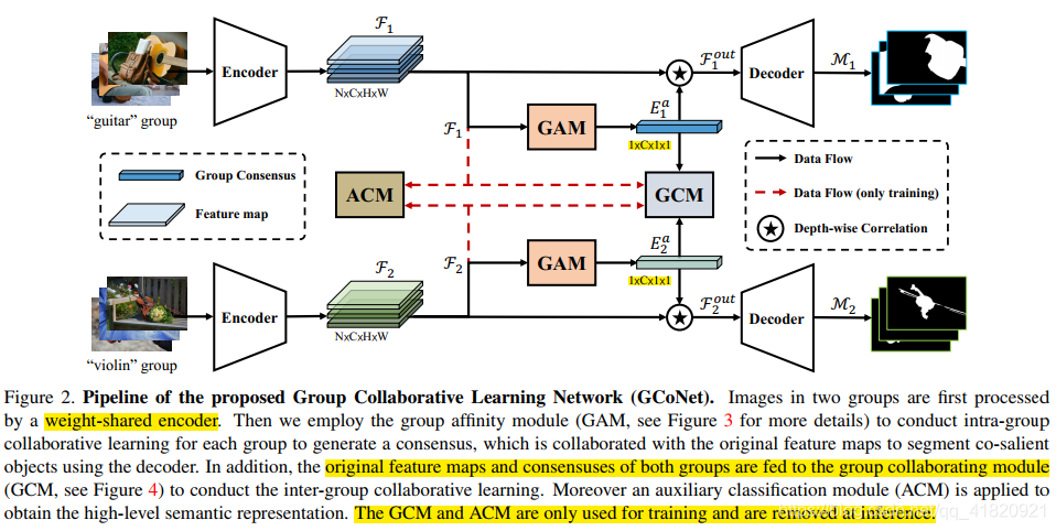 针对上述问题,本文提出了组的共同学习框架(group collaborative learning framework,GCoNet)来挖掘不同图像组之间的语义关联,GCoNet包括三部分:组关联模块(group affinity module,GAM)、组的合作模块(group collaborating module,GAM)、辅助分类模块(auxiliary classification module, ACM).前二者的作用如摘要中所示,后者作用为在全局语义级别提升特征表示,在每个图像上学习更好的嵌入空间。