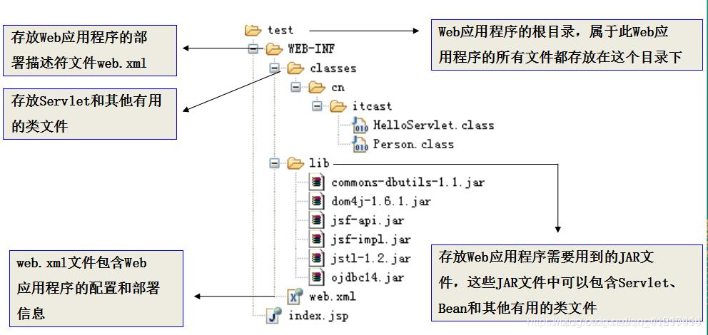 说明:①WEB-INF目录下的classes和lib目录都可以存放java类文件,在Servlet容器运行时,Web应用程序的类加载器将首先加载classes目录下的,其次才是lib目录下的类。如果这两个目录下存在同名的类,起作用的将是classes目录下 的类