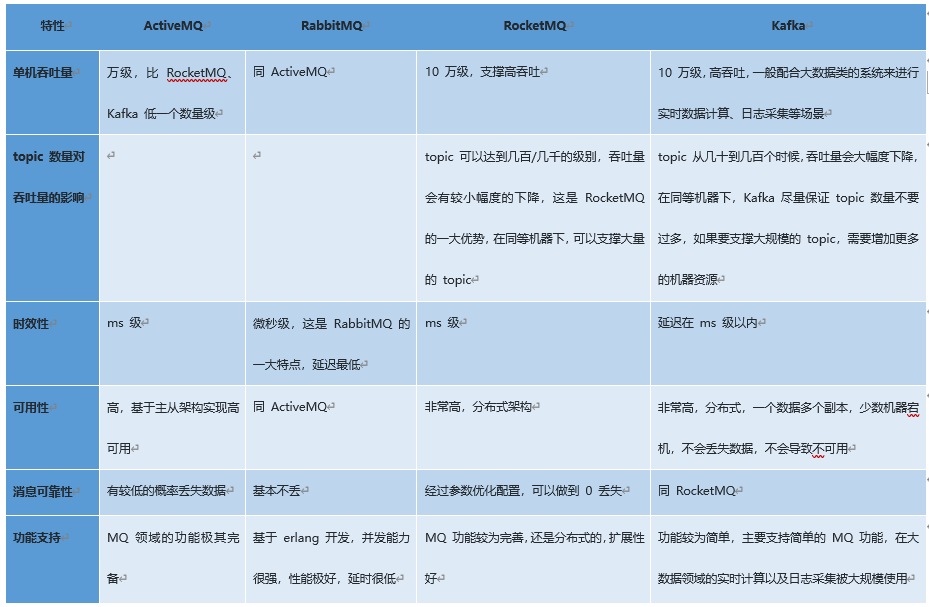 所以中小型公司,技术实力较为一般,技术挑战不是特别高,用 RabbitMQ 是不错的选择;大型公司,基础架构研发实力较强,用 RocketMQ 是很好的选择。