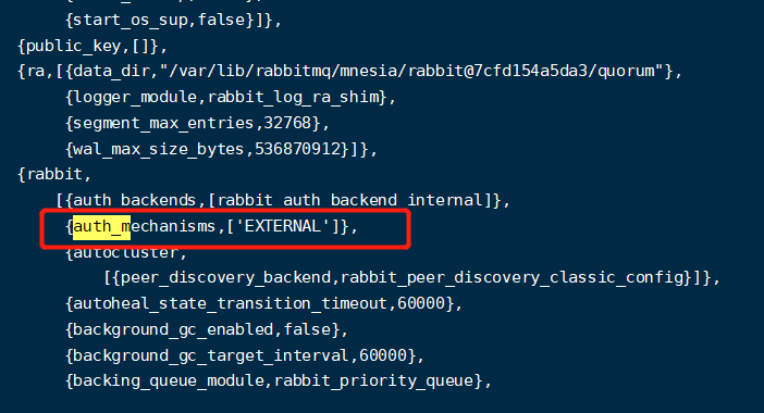 在下图位置看到相应的配置, {auth_mechanisms,['EXTERNAL']},则表示配置生效