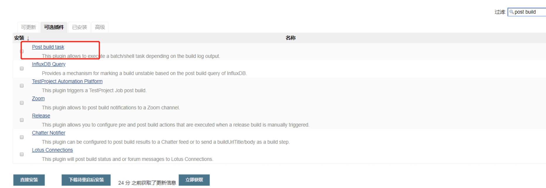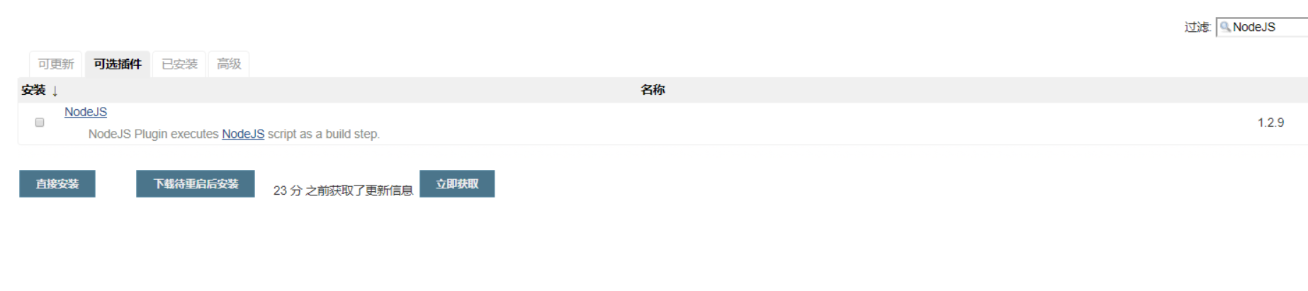 1:登陆jenkins,在系统管理——插件管理中,添加两个插件。Node.js和Post build task.