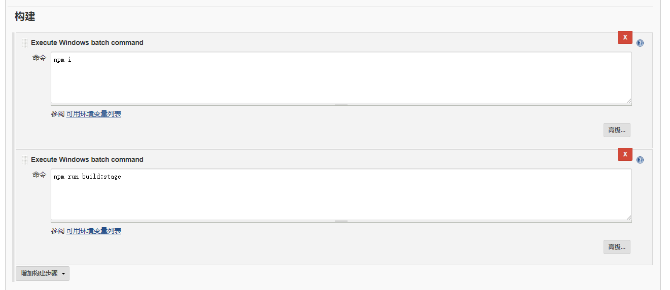 其中node.js是用来打包vue项目,post build task用来把打包好的项目自动移动到nginx目录。